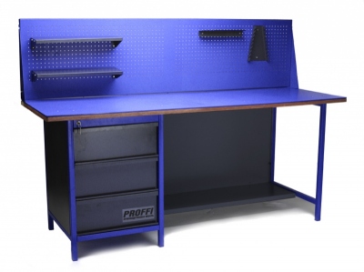 Верстаки серии «PROFFI» предназначены для установки в производственных помещениях и собираются в различной комплектации из отдельных элементов:nbsp; PROFFI опора - синего цвета; PROFFI ножка - синего цвета; ; PROFFI столешница 1 Д (2Д, 3Д) из 24 мм фанеры, обработаны защитным лакокрасочным покрытием; PROFFI столешница 1М (2М, 3М) из стального листа 6 мм; возможны варианты установки комбинированных PROFFI столешниц (фанера 24 мм + металл 6 мм) и PROFFI столешниц ( фанера 24 мм + металлическая накладка 2 мм); ; PROFFI тумба с дверцей -nbsp; все элементы серого цвета; PROFFI тумба с ящиками, все элементы серого цвета; PROFFI полка/стенка 1 (2), серого цвета; ВСС экран 2 (3) синего цвета, с комплектом навесок серого цвета (полка - 2 шт., держатель отверток - 1 шт., держатель ключей - 1 шт.). В комплектацию ящиков входит пластиковая ручка.
