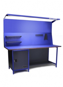 2000х830х700мм Состоит из PROFFI Столешница (Сталь 6мм) PROFFI Столешница (фанера) с большим экраном и подсветкой PROFFI Опора, PROFFI Полка/стенка2 PROFFI Тумбы с дверцей,. Верстаки серии «PROFFI» предназначены для установки в производственных помещениях и собираются в различной комплектации из отдельных элементов:nbsp; PROFFI опора - синего цвета;nbsp; PROFFI ножка -nbsp; синего цвета;  PROFFI столешница 1 Д (2Д, 3Д) из 24 мм фанеры, обработаны защитным лакокрасочным покрытием; PROFFI столешница 1М (2М, 3М) из стального листа 6 мм; возможны варианты установки комбинированных PROFFI столешниц (фанера 24 мм + металл 6 мм) и PROFFI столешниц ( фанера 24 мм + металлическая накладка 2 мм);  PROFFI тумба с дверцей -  все элементы серого цвета;nbsp; PROFFI тумба с ящиками, все элементы серого цвета; PROFFI полка/стенка 1 (2), серого цвета;nbsp; ВСС экран 2 (3) синего цвета, с комплектом навесок серого цвета (полка - 2 шт., держатель отверток - 1 шт., держатель ключей - 1 шт.). В комплектацию ящиков входит пластиковая ручка. Сверху экрана установлена подсветка на магнитных креплениях для легкого монтажа.