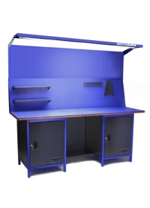 2000х830х700мм Состоит из PROFFI Столешница (сталь 6мм) PROFFI Столешница (фанера) с большим экраном и подсветкой, PROFFI Полка/стенка1 двухnbsp;PROFFI Тумбы с дверцей,. Верстаки серии «PROFFI» предназначены для установки в производственных помещениях и собираются в различной комплектации из отдельных элементов:nbsp; PROFFI опора - синего цвета;nbsp; PROFFI ножка -nbsp; синего цвета;nbsp; PROFFI столешница 1 Д (2Д, 3Д) из 24 мм фанеры, обработаны защитным лакокрасочным покрытием; PROFFI столешница 1М (2М, 3М) из стального листа 6 мм; возможны варианты установки комбинированных PROFFI столешниц (фанера 24 мм + металл 6 мм) и PROFFI столешниц ( фанера 24 мм + металлическая накладка 2 мм);nbsp; PROFFI тумба с дверцей -nbsp; все элементы серого цвета;nbsp; PROFFI тумба с ящиками, все элементы серого цвета; PROFFI полка/стенка 1 (2), серого цвета;nbsp; ВСС экран 2 (3) синего цвета, с комплектом навесок серого цвета (полка - 2 шт., держатель отверток - 1 шт., держатель ключей - 1 шт.). В комплектацию ящиков входит пластиковая ручка. Сверху экрана установлена подсветка на магнитных креплениях для легкого монтажа.