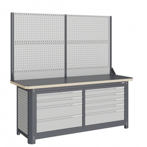 Верстак серии MECHANIC: MCN 2052.L45-2 состоит из столешницы шириной 1993 мм, рамы верстака, состоящей из опор, перемычек, боковых перфопанелей, больших модулей L4 и L5, двойного экрана с кронштейнами.