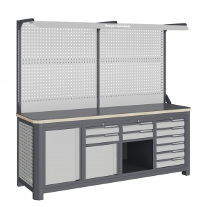 Верстак серии MECHANIC: MCN 2052.S2679.2-2F состоит из столешницы шириной 1993 мм, рамы верстака, состоящей из опор, перемычек, боковых перфопанелей, малых модулей S6, S7, S9, S2 и комплекта полка-стенка SW2, двойного экран с кронштейнами и комплектом освещения.