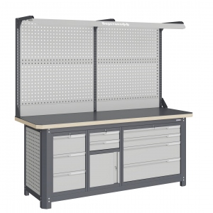 Верстак серии MECHANIC: MCN 2052.S39L4-2F состоит из столешницы шириной 1993 мм, рамы верстака, состоящей из опор, перемычек, боковых перфопанелей, двух малых модуля S3 и S9, одного большого модуля L4, двойного экрана с кронштейнами и комплекта освещения.
