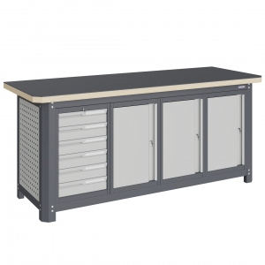 Верстак серии MECHANIC: MCN 2052.S6777 состоит из столешницы шириной 1993 мм, рамы верстака, состоящей из опор, перемычек, боковых перфопанелей, малых модулей S6 и S7.