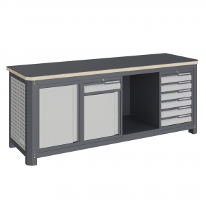 Верстак серии MECHANIC: MCN 2052.S678.1 состоит из столешницы шириной 1993 мм, рамы верстака, состоящей из опор, перемычек, боковых перфопанелей, малых модулей S6, S7, S8 и комплекта полка-стенка SW1.