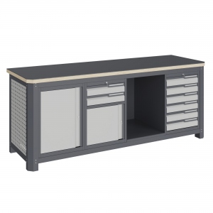 Верстак серии MECHANIC: MCN 2052.S679.1 состоит из столешницы шириной 1993 мм, рамы верстака, состоящей из опор, перемычек, боковых перфопанелей, малых модулей S6, S7, S9 и комплекта полка-стенка SW1.