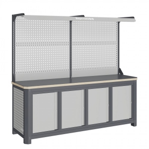Верстак серии MECHANIC: MCN 2052.S7777-2F состоит из столешницы шириной 1993 мм, рамы верстака, состоящей из опор, перемычек, боковых перфопанелей, четырех малых модулей S7, двойного экрана с кронштейнами и комплекта освещения.