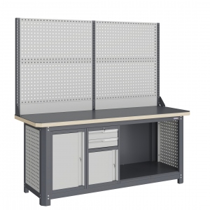 Верстак серии MECHANIC: MCN 2052.S79.11-2 состоит из столешницы шириной 1993 мм, рамы верстака, состоящей из опор, перемычек, боковых перфопанелей, малых модулей S7, S9 и двух комплектов полка-стенка SW1, двойного экрана с кронштейнами.