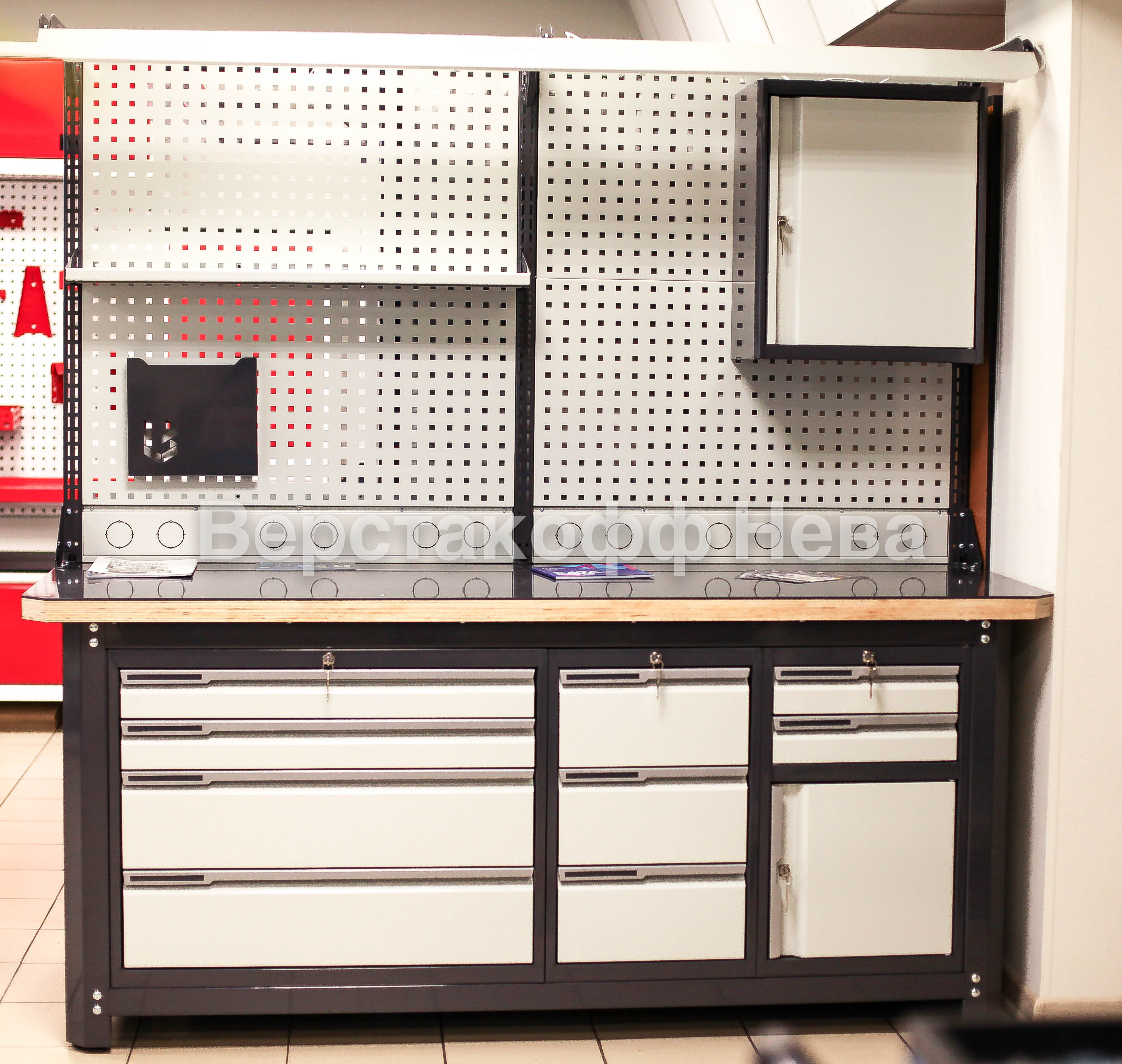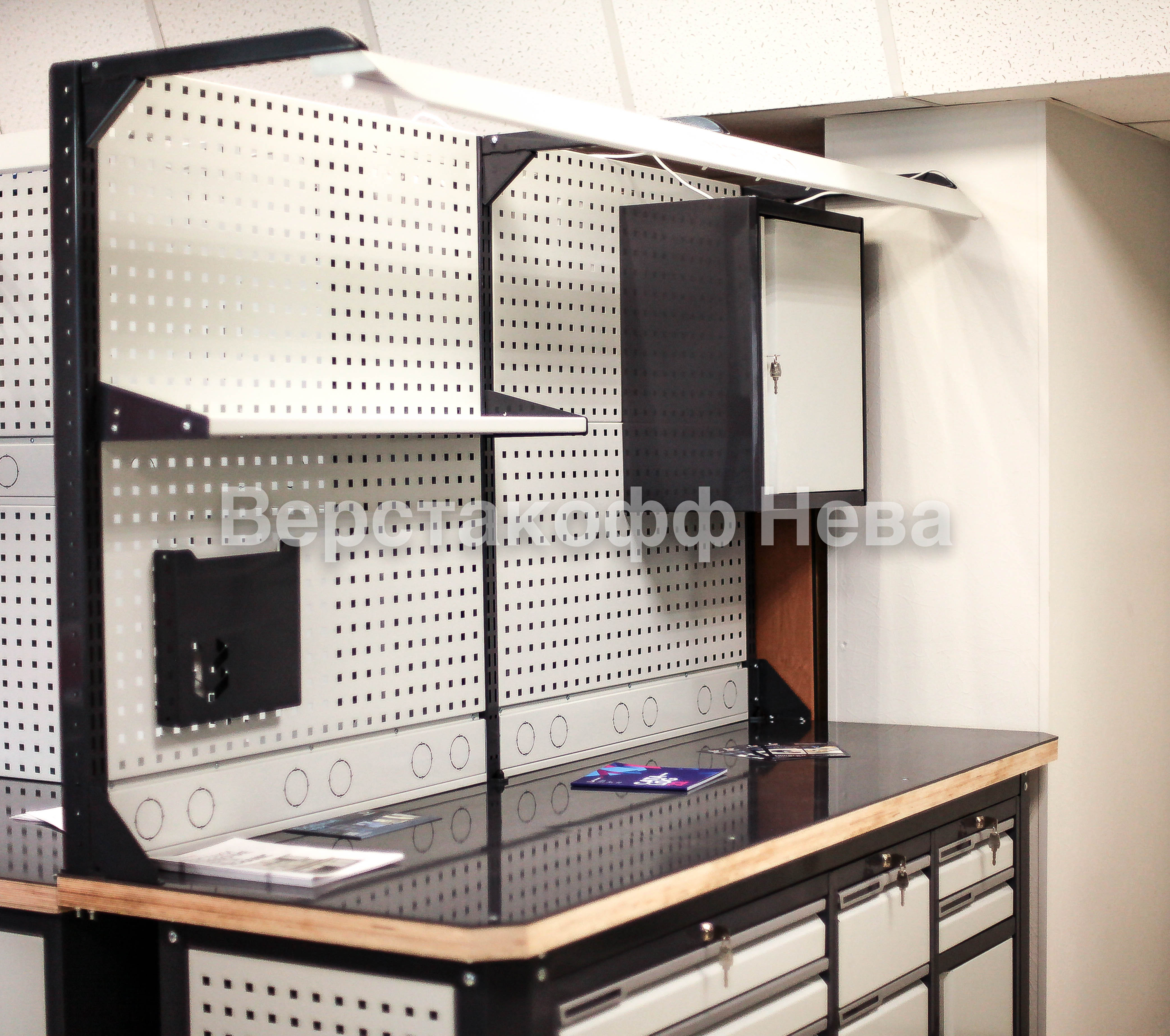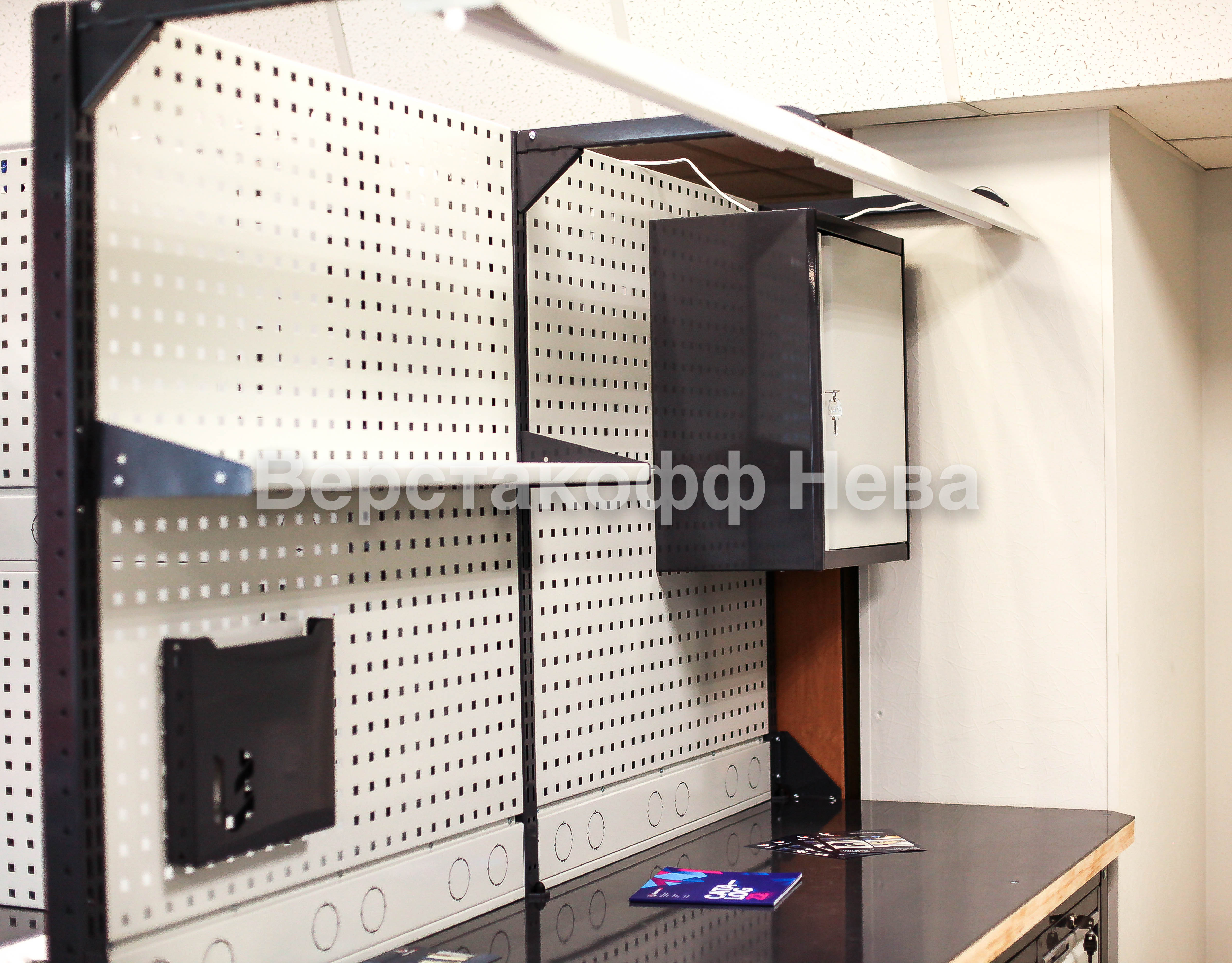 Экран (перфорированная панель) верстака выполнен с квадратной перфорацией 12х12 мм с шагом 38 мм для установки крючков, держателей и других аксессуаров. Экран крепятся к столешнице с помощью специальных кронштейнов. Максимальная масса груза, равномерно распределенного по поверхности экрана, составляет 71 кг.