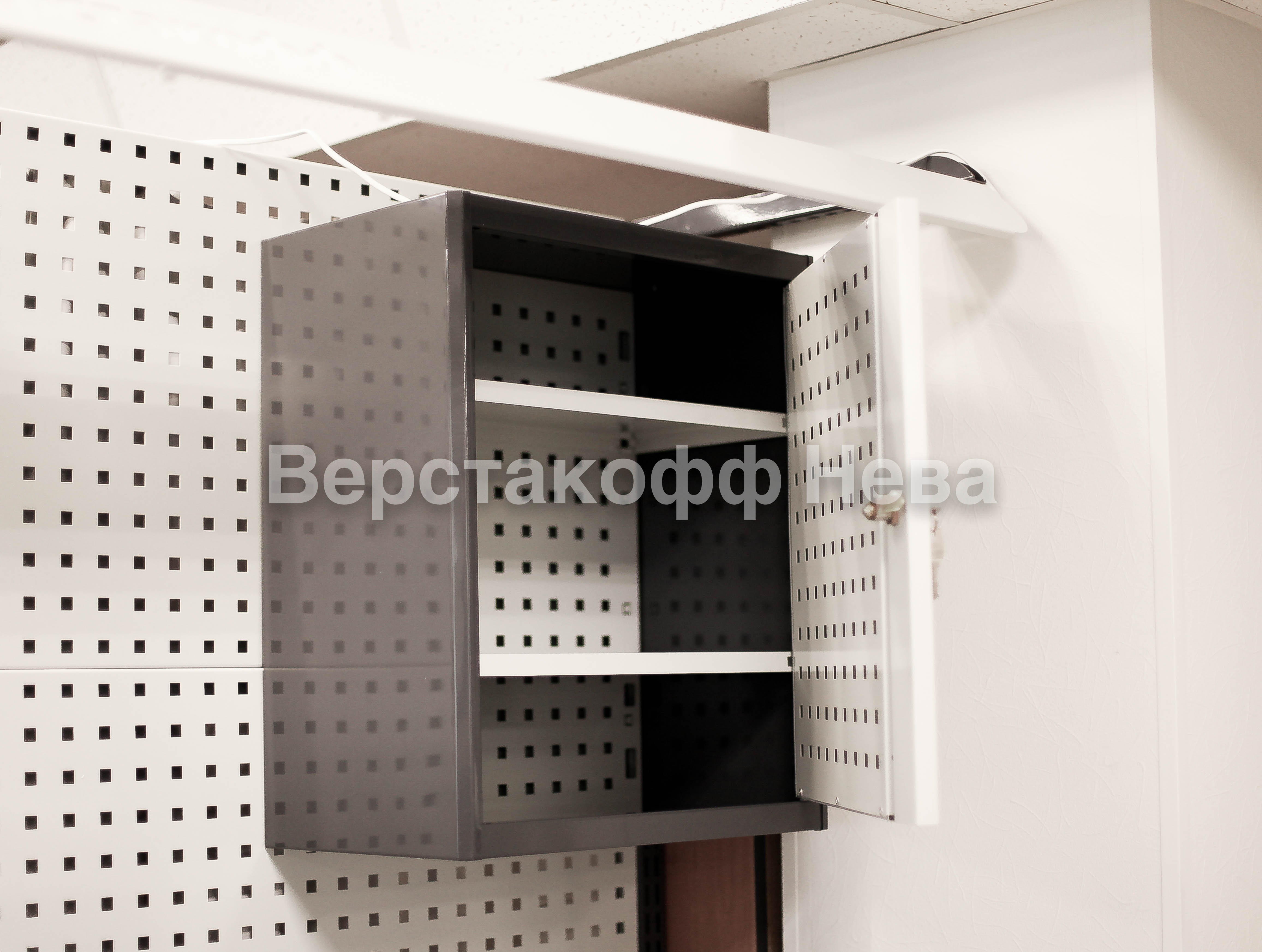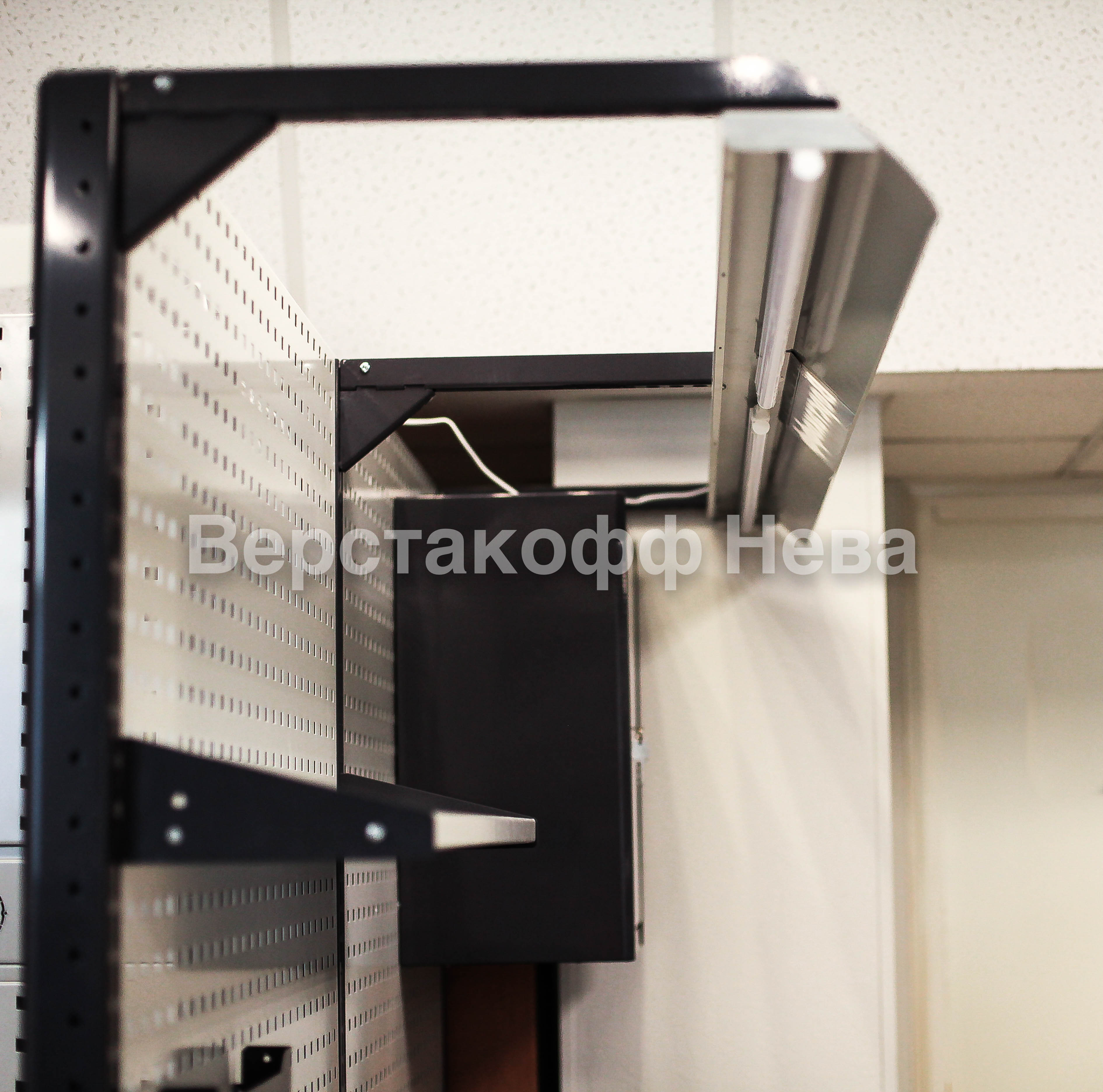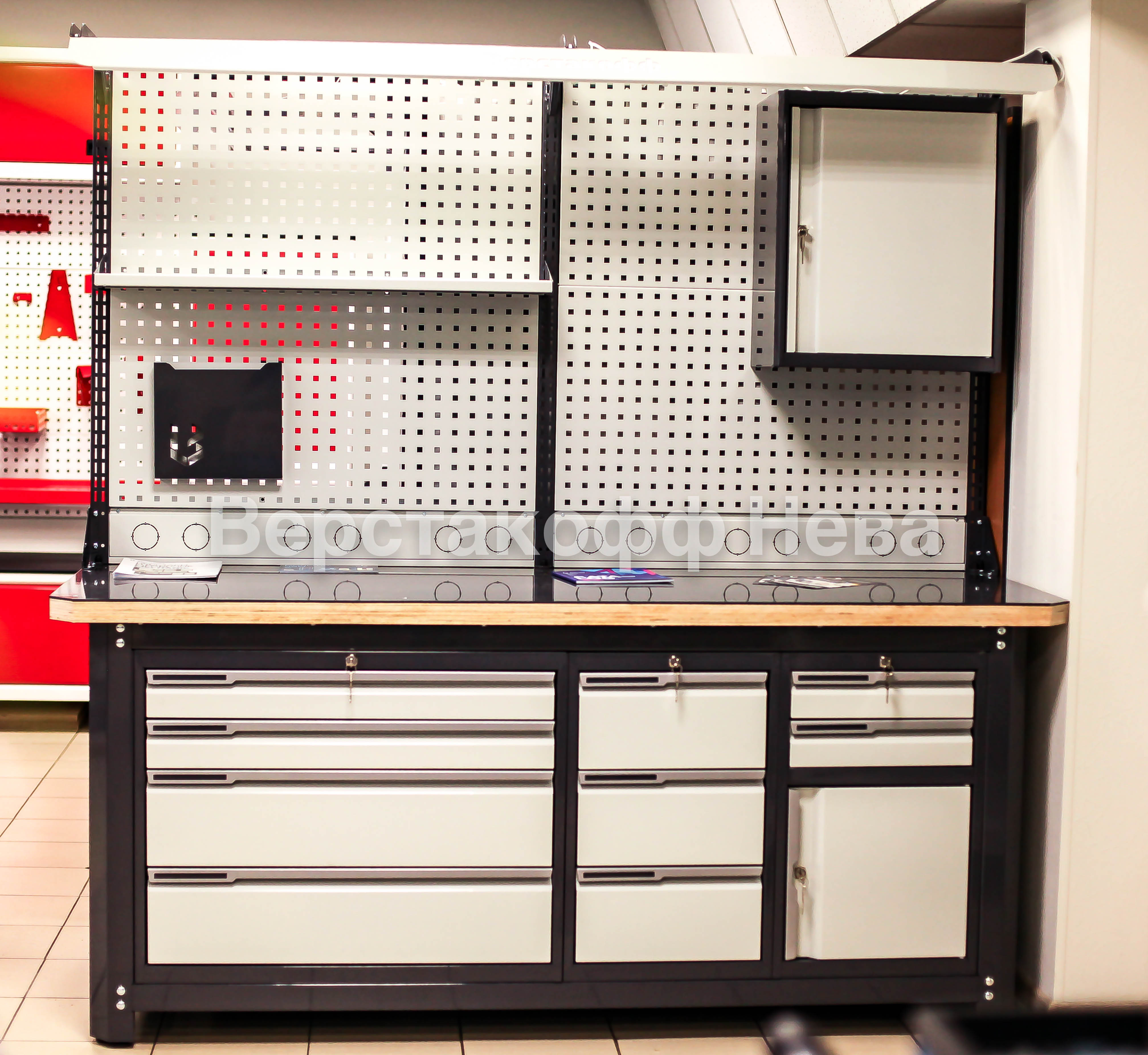 Экран (перфорированная панель) верстака выполнен с квадратной перфорацией 12х12 мм с шагом 38 мм для установки крючков, держателей и других аксессуаров. Экран крепятся к столешнице с помощью специальных кронштейнов. Максимальная масса груза, равномерно распределенного по поверхности экрана, составляет 71 кг.