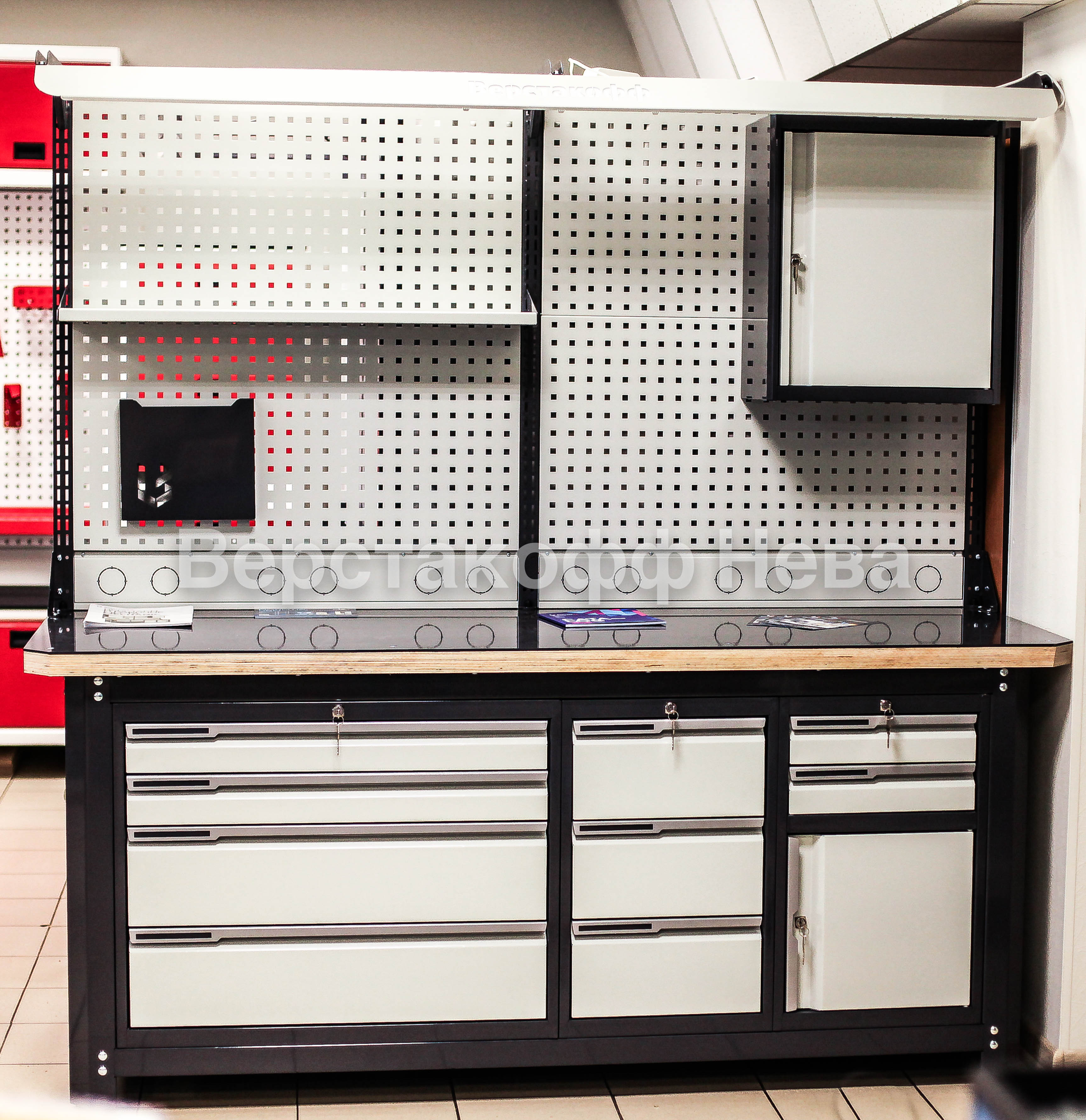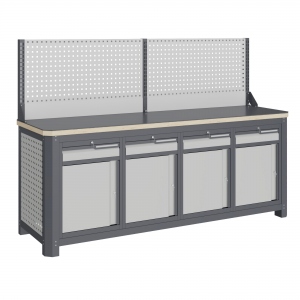 Верстак серии MECHANIC: MCN 2052.S8888-1 состоит из столешницы шириной 1993 мм, рамы верстака, состоящей из опор, перемычек, боковых перфопанелей, четырех малых модулей S8, одинарного экрана с кронштейнами.