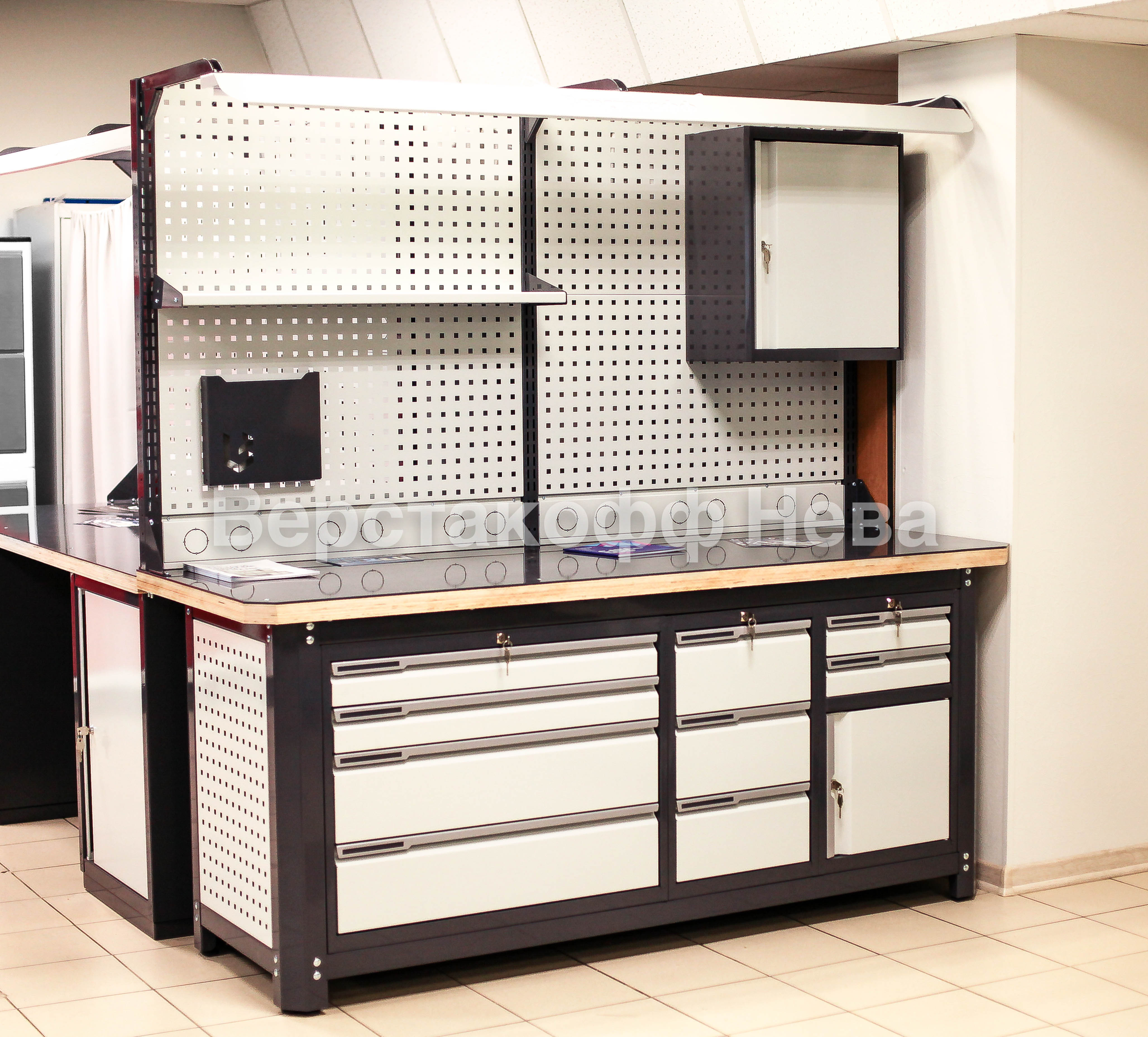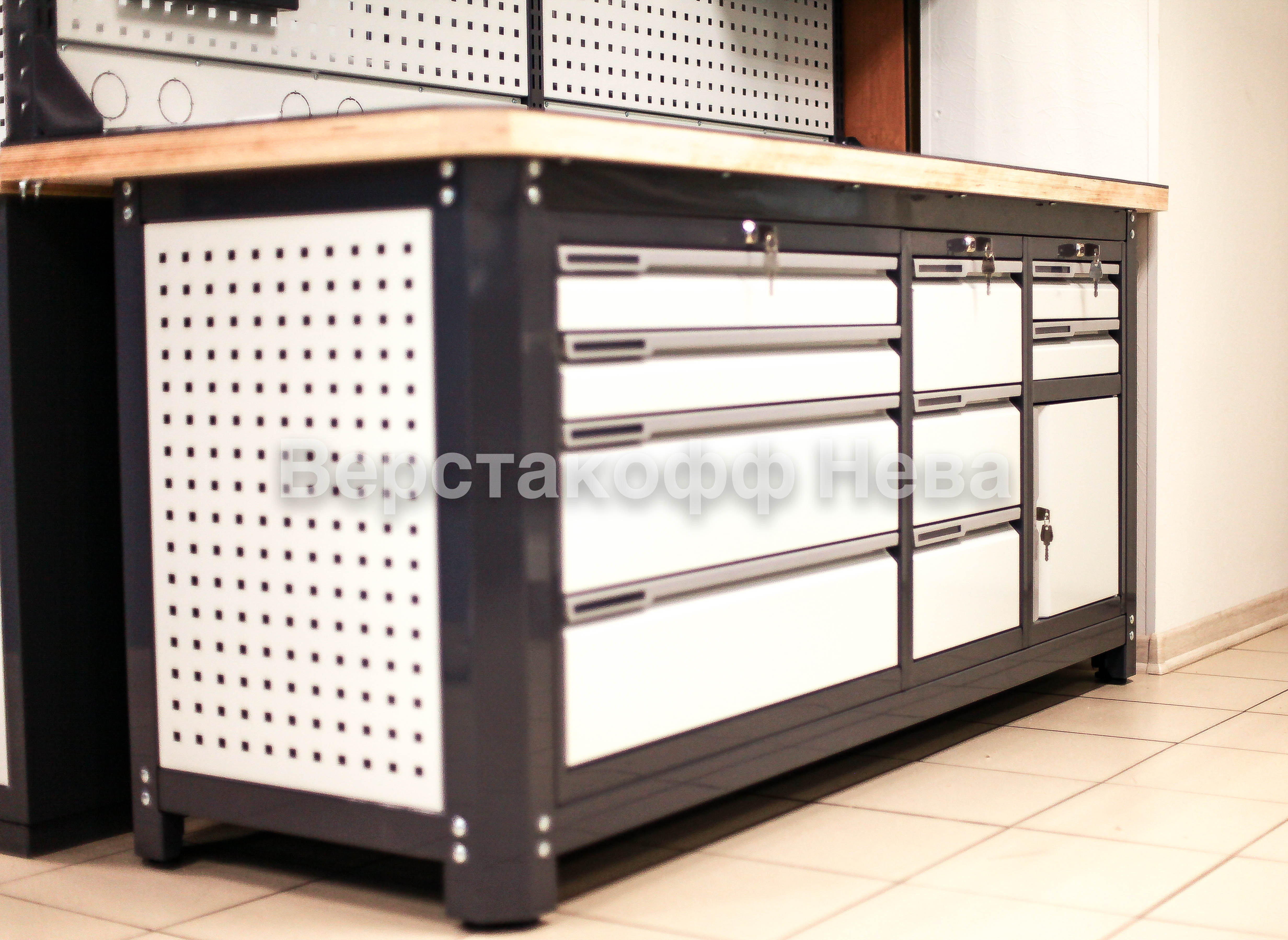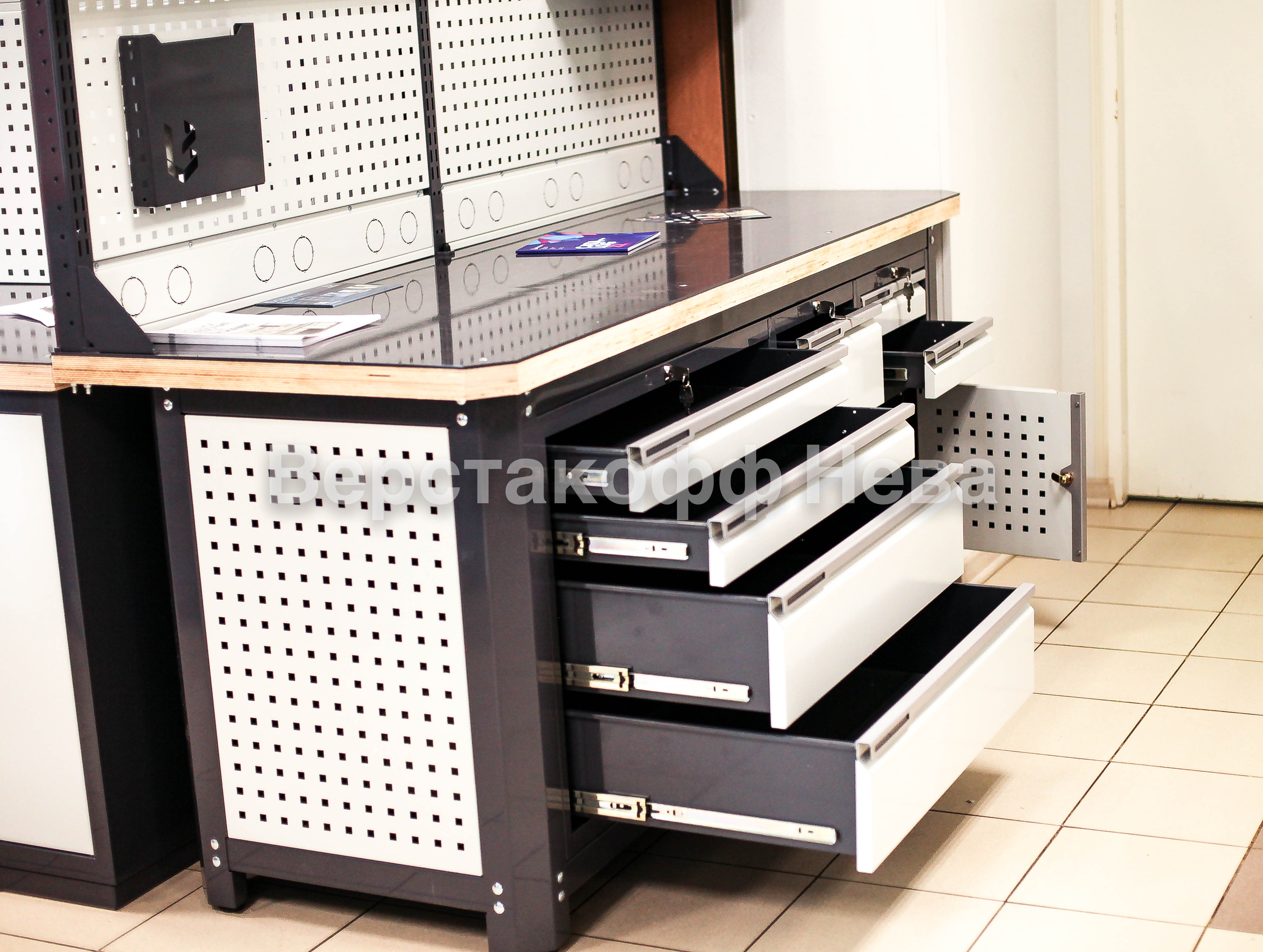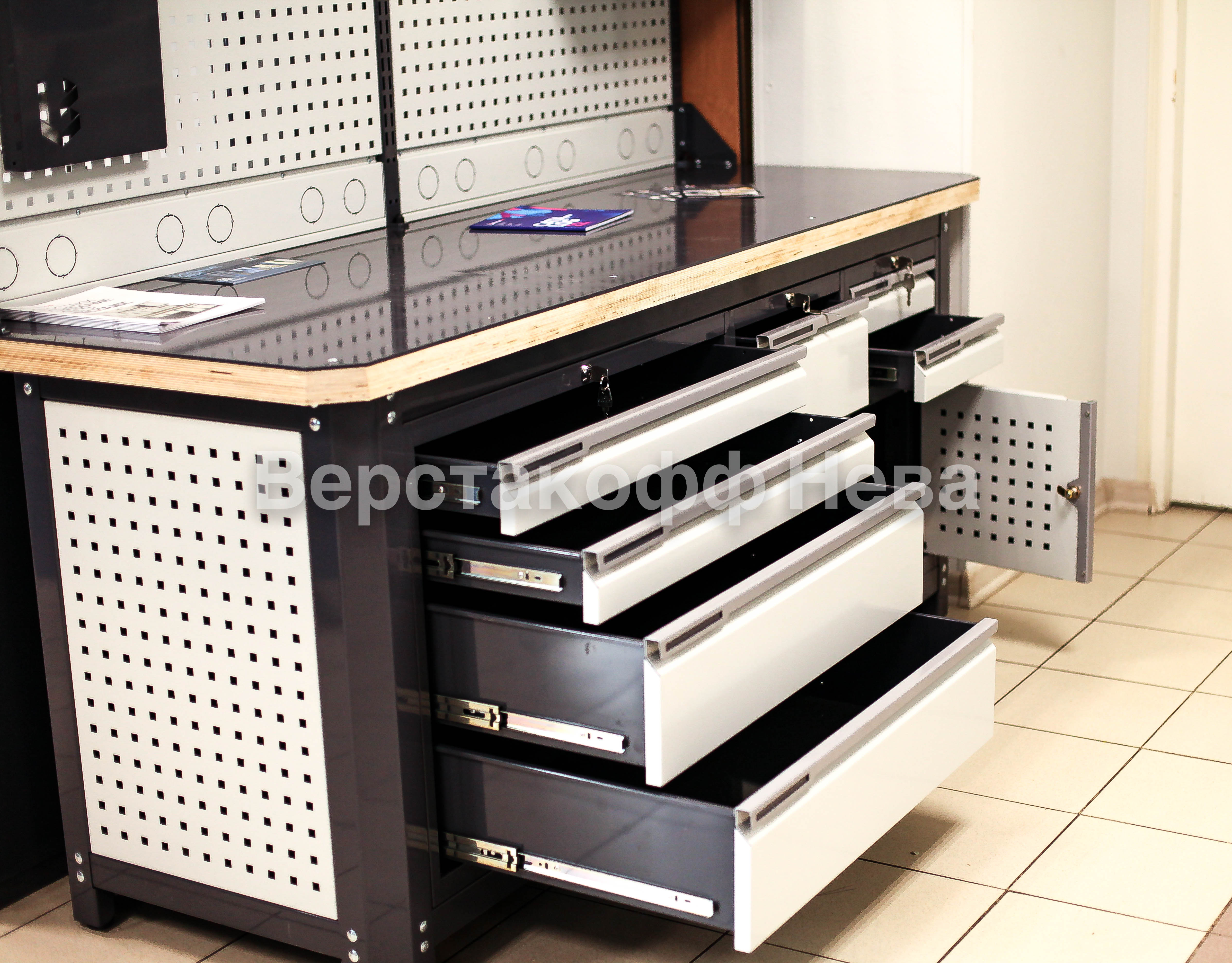 Модуль верстака выполнен сварными. Ящики в модулях устанавливаются на шариковых телескопических направляющих полного выдвижения.