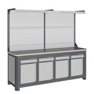 Верстак серии MECHANIC: MCN 2052.S8888-2F состоит из столешницы шириной 1993 мм, рамы верстака, состоящей из опор, перемычек, боковых перфопанелей, четырех малых модулей S8, двойного экрана с кронштейнами и комплектом освещения.