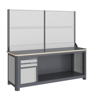 Экран (перфорированная панель) верстака выполнен с квадратной перфорацией 12х12 мм с шагом 38 мм для установки крючков, держателей и других аксессуаров. Экран крепятся к столешнице с помощью специальных кронштейнов. Максимальная масса груза, равномерно распределенного по поверхности экрана, составляет 71 кг.