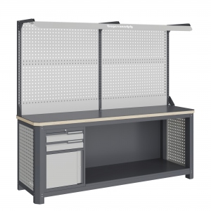 Верстак серии MECHANIC: MCN 2052.S9.111-2F состоит из столешницы шириной 1993 мм, рамы верстака, состоящей из опор, перемычек, боковых перфопанелей, малого модуля S9 и трех комплектов полка-стенка SW1, двойного экрана с кронштейнами и комплектом освещения.