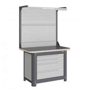 Верстак серии MECHANIC: MCN 1252.L4-2F состоит из столешницы шириной 1193 мм, рамы верстака, состоящей из опор, перемычек, боковых перфопанелей, большого модуля L4, двойного экрана с кронштейнами и комплекта освещения.