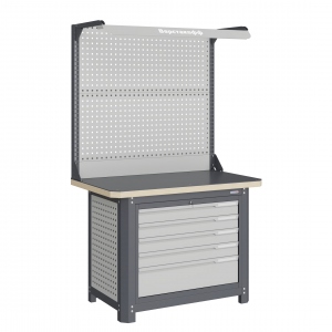 Верстак серии MECHANIC: MCN 1252.L5-2F состоит из столешницы шириной 1193 мм, рамы верстака, состоящей из опор, перемычек, боковых перфопанелей, большого модуля L5, двойного экрана с кронштейнами и комплекта освещения.