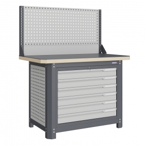 Верстак серии MECHANIC: MCN 1252.L6-1 состоит из столешницы шириной 1193 мм, рамы верстака, состоящей из опор, перемычек, боковых перфопанелей, большого модуля L6, одинарного экрана с кронштейнами.