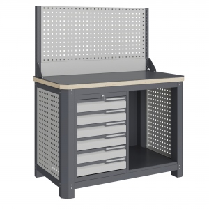 Верстак Верстакофф MECHANIC: MCN 1252.S6.1-1 состоит из столешницы шириной 1193 мм, рамы верстака, состоящей из опор, перемычек, боковых перфопанелей, небольшого модуля с ящиками S6, комплекта полка-стенка SW1, экрана с кронштейнами.