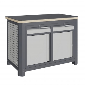 Верстак Верстакофф MECHANIC: MCN 1252.S88 состоит из столешницы шириной 1193 мм, рамы верстака, состоящей из опор, перемычек, боковых перфопанелей, двух небольших модулей S8 (один ящик и дверца).