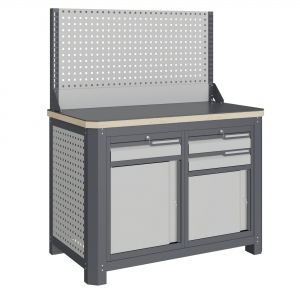 Рабочее место MECHANIC: MCN 1252.S89-1 состоит из столешницы шириной 1193 мм, рамы верстака, состоящей из опор, перемычек, боковых перфопанелей, двух небольших модулей S8 (один ящик и дверца) и S9 ( два ящика и дверца), экрана с кронштейнами.