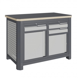 Рабочее место MECHANIC: MCN 1252.S89 состоит из столешницы шириной 1193 мм, рамы верстака, состоящей из опор, перемычек, боковых перфопанелей, двух небольших модулей S8 (один ящик и дверца) и S9 ( два ящика и дверца).