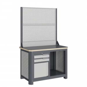 Рабочее место MECHANIC: MCN 1252.S9.1-2 состоит из столешницы шириной 1193 мм, рамы верстака, состоящей из опор, перемычек, боковых перфопанелей, небольшого модуля S9 (два ящика с дверцей), комплекта полка-стенка SW1, двойного экрана с кронштейнами.