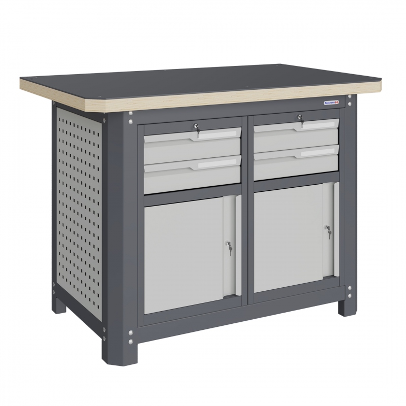 Рабочее место MECHANIC: MCN 1252.S99 состоит из столешницы шириной 1193 мм, рамы верстака, состоящей из опор, перемычек, боковых перфопанелей, двух небольших модулей S9 (два ящика и дверца).