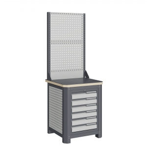 Верстак серии MECHANIC: MCN 0752.S6-2 состоит из столешницы шириной 693 мм, рамы верстака, состоящей из опор, перемычек, боковых перфопанелей, малого модуля S6, двойного экрана с кронштейнами.