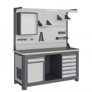 Рабочее место MECHANIC: MCN 1552.S68.1-2FR состоит из столешницы шириной 1493 мм, рамы верстака, состоящей из опор, перемычек, боковых перфопанелей, малых модулей S6 и S8, полки-стенки SW1, двойного экрана с кронштейнами, комплекта освещения и блока коммуникаций.