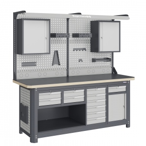 Верстак серии MECHANIC: MCN 2052.S2268.22-2FR состоит из столешницы шириной 1993 мм, рамы верстака, состоящей из опор, перемычек, боковых перфопанелей, двух модулей S6 и S8, два модуля S2 c комплектами полка-стенка SW2, двойного экрана с кронштейнами, комплекта освещения и блока коммуникаций.