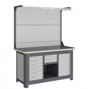 Верстак серии MECHANIC: MCN 1552.S267.2-2F состоит из столешницы шириной 1493 мм, рамы верстака, состоящей из опор, перемычек, боковых перфопанелей, малых модулей S6, S7 и модуля S2 с комплектом полка-стенка SW2, двойного экрана с кронштейнами и комплектом освещения.