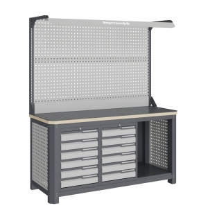 Верстак серии MECHANIC: MCN 1552.S66.1-2F состоит из столешницы шириной 1493 мм, рамы верстака, состоящей из опор, перемычек, боковых перфопанелей, двух малых модулей S6, комплекта полка-стенка SW1, двойного экрана с кронштейнами и комплекта освещения.