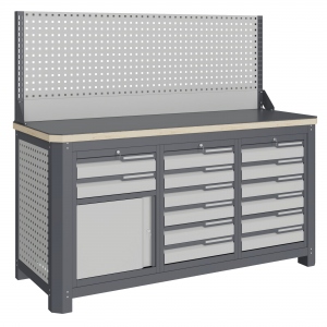 Верстак серии MECHANIC: MCN 1552.S669-2 состоит из столешницы шириной 1493 мм, рамы верстака, состоящей из опор, перемычек, боковых перфопанелей, малых модулей S6 и S9, двойного экрана с кронштейнами.