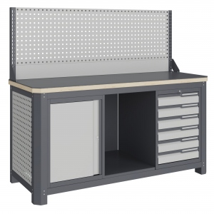 Верстак серии MECHANIC: MCN 1552.S67.1-1 состоит из столешницы шириной 1493 мм, рамы верстака, состоящей из опор, перемычек, боковых перфопанелей, малых модулей S6, S7 и комплекта полка-стенка SW1, одинарного экрана с кронштейнами.