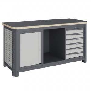 Верстак серии MECHANIC: MCN 1552.S67.1 состоит из столешницы шириной 1493 мм, рамы верстака, состоящей из опор, перемычек, боковых перфопанелей, малых модулей S6, S7 и комплекта полка-стенка SW1.