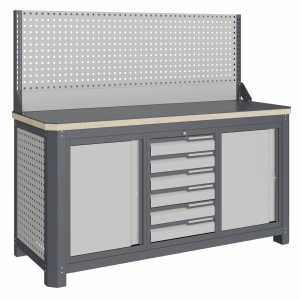 Верстак серии MECHANIC: MCN 1552.S677-1 состоит из столешницы шириной 1493 мм, рамы верстака, состоящей из опор, перемычек, боковых перфопанелей, малых модулей S6, S7, одинарного экрана с кронштейнами.