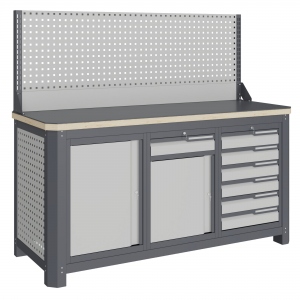 Верстак серии MECHANIC: MCN 1552.S678-1 состоит из столешницы шириной 1493 мм, рамы верстака, состоящей из опор, перемычек, боковых перфопанелей, малых модулей S6, S7, S8, одинарного экран с кронштейнами.