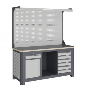 Верстак серии MECHANIC: MCN 1552.S68.1-2F состоит из столешницы шириной 1493 мм, рамы верстака, состоящей из опор, перемычек, боковых перфопанелей, малых модулей S6 и S8, комплекта полка-стенка SW1, двойного экрана с кронштейнами и комплектом освещения.
