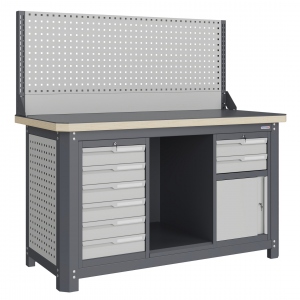 Верстак серии MECHANIC: MCN 1552.S69.1-1 состоит из столешницы шириной 1493 мм, рамы верстака, состоящей из опор, перемычек, боковых перфопанелей, малых модулей S6 и S9, комплекта полка-стенка SW1, одинарного экрана с кронштейнами.