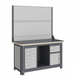 Верстак серии MECHANIC: MCN 1552.S69.1-2 состоит из столешницы шириной 1493 мм, рамы верстака, состоящей из опор, перемычек, боковых перфопанелей, малых модулей S6 и S9, комплекта полка-стенка SW1, двойного экрана с кронштейнами.