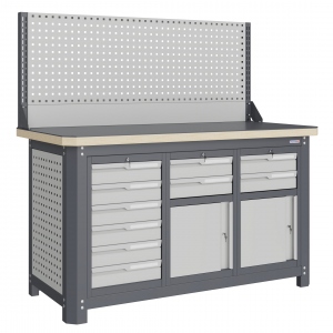 Верстак серии MECHANIC: MCN 1552.S699-1 состоит из столешницы шириной 1493 мм, рамы верстака, состоящей из опор, перемычек, боковых перфопанелей, малых модулей S6 и S9, одинарного экрана с кронштейнами.