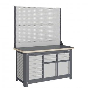 Верстак серии MECHANIC: MCN 1552.S699-2 состоит из столешницы шириной 1493 мм, рамы верстака, состоящей из опор, перемычек, боковых перфопанелей, малых модулей S6 и S9, двойного экрана с кронштейнами.