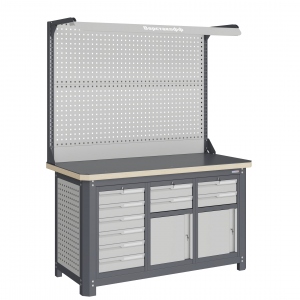 Верстак серии MECHANIC: MCN 1552.S699 состоит из столешницы шириной 1493 мм, рамы верстака, состоящей из опор, перемычек, боковых перфопанелей, малых модулей S6 и S9.