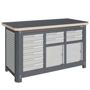 Верстак серии MECHANIC: MCN 1552.S699 состоит из столешницы шириной 1493 мм, рамы верстака, состоящей из опор, перемычек, боковых перфопанелей, малых модулей S6 и S9.
