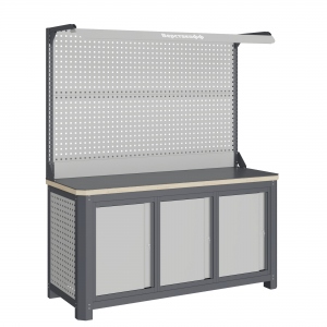 Верстак серии MECHANIC: MCN 1552.S777-2F состоит из столешницы шириной 1493 мм, рамы верстака, состоящей из опор, перемычек, боковых перфопанелей, четырех малых модулей S7, двойного экрана с кронштейнами комплектом освещения.
