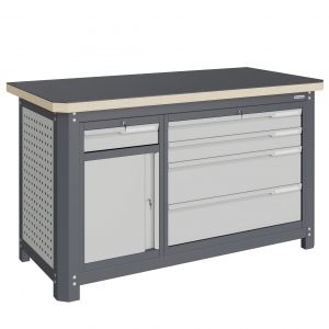 Верстак серии MECHANIC: MCN 1552.S8L4 состоит из столешницы шириной 1493 мм, рамы верстака, состоящей из опор, перемычек, боковых перфопанелей, малого модуля S8, большого модуля L4.