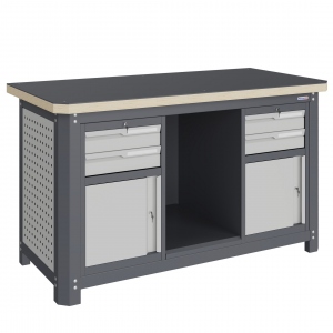 Верстак серии MECHANIC: MCN 1552.S99.1 состоит из столешницы шириной 1493 мм, рамы верстака, состоящей из опор, перемычек, боковых перфопанелей, двух малых модулей S9, комплекта полка-стенка SW1.