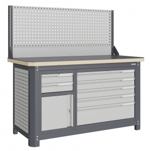 Верстак серии MECHANIC: MCN 1552.S9L5-1 состоит из столешницы шириной 1493 мм, рамы верстака, состоящей из опор, перемычек, боковых перфопанелей, малого модуля S9 большого модуля L5, одинарного экрана с кронштейнами.