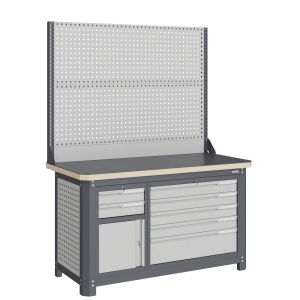 Верстак серии MECHANIC: MCN 1552.S9L5-2 состоит из столешницы шириной 1493 мм, рамы верстака, состоящей из опор, перемычек, боковых перфопанелей, малого модуля S9 большого модуля L5, двойного экрана с кронштейнами.