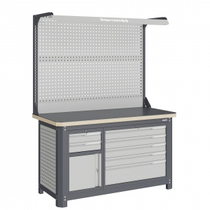Верстак серии MECHANIC: MCN 1552.S9L5-2F состоит из столешницы шириной 1493 мм, рамы верстака, состоящей из опор, перемычек, боковых перфопанелей, малого модуля S9 большого модуля L5, двойного экрана с кронштейнами и комплекта освещения.